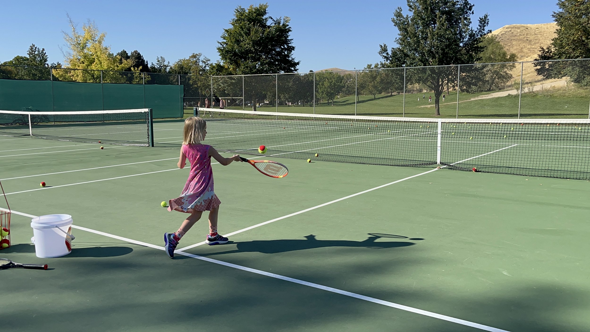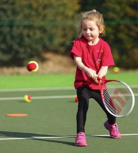 Little kids, little tennis. Big red balls that are easier to see and bounce lower. Little cute rackets, little cute courts with mini nets. Big fun.